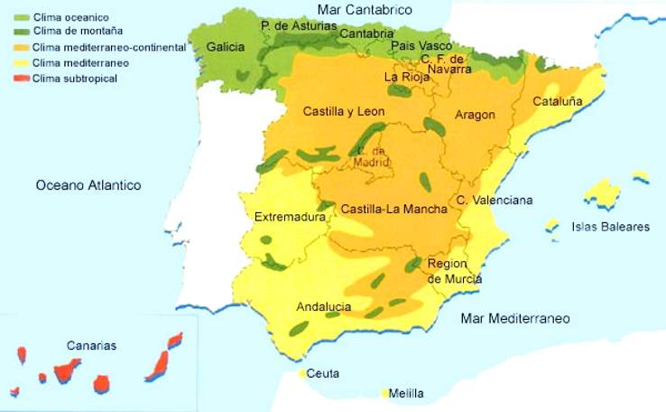 Как-то общепринято считать, что Испания — это типично средиземноморская страна. В принципе, она, несомненно, весьма близка к этой теоретической модели. По географическому положению: между 43 и 36 градусами северной широты, Испания находится в зоне умеренного климата, однако поблизости проходит тропик Рака, поэтому климат Испании следует квалифицировать как умеренно-жаркий. Тем не менее, наряду с этим расположенность страны на западной оконечности Старого Света привносит в климат Испании одну особую и исключительную черту: жаркое и очень сухое лето. Иными словами, на западном побережье страны преобладает классический умеренно-жаркий климат, а на Средиземноморье — климат средиземноморский, или т.н. — оливковый.
