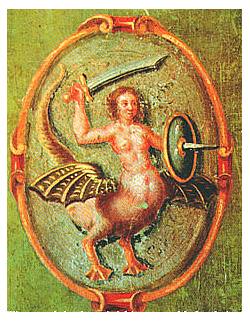 Самая древняя печать Варшавы (примерно 1400 г.) изображает ее герб в виде вооруженного щитом и мечом получеловека-полуптицы, с животом, покрытым чешуей. (см. илл. в самом начале статьи, но скорее на ней изображен получеловек-полудракон. Прим. Portalostranah.com).
