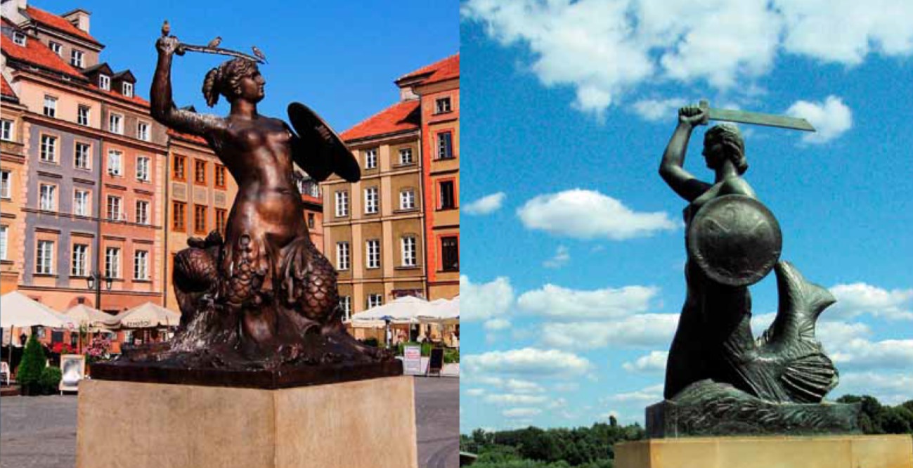 Слева: Русалка на Рыночной площади района Старого города Варшавы. Справа: памятник Русалке на варшавской набережной Костюшко.