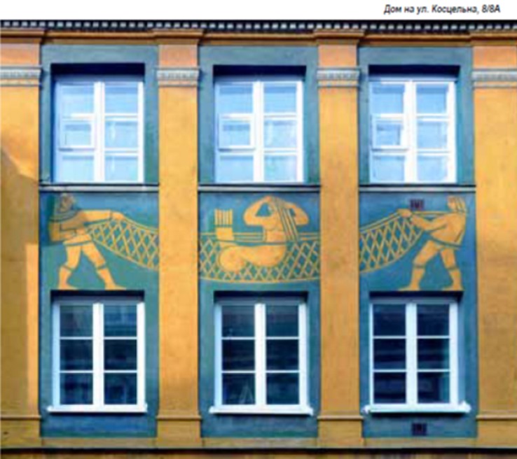 Один из домов в Варшаве, на фасаде которого красуется изображение русалки, В данном случае в сетях рыбаков.